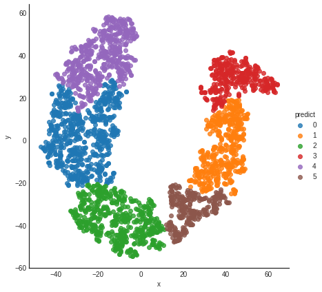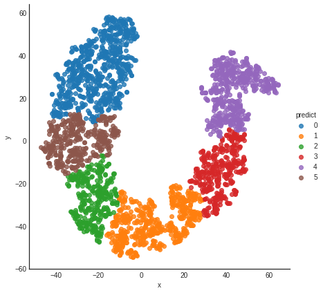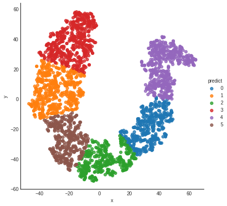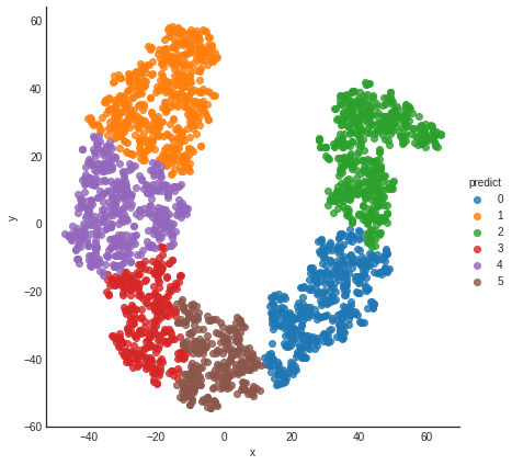 sns.lmplot('x','y',data = results,fit_reg = False,size = 6,hue = 'predict')