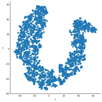 sns.lmplot('x','y',data = df,fit_reg = False,size = 6)