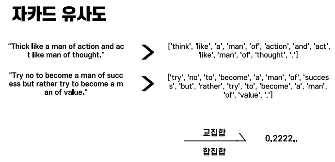 • 두 텍스트 문서 사이에 공통된 용어의 수와 해당 텍스트에 존재하는 총 고유 용어 수의 비율을 사용한다.