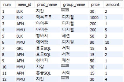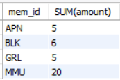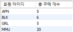 SELECT mem_id '회원 아이디', SUM(amount) '총 구매 개수'