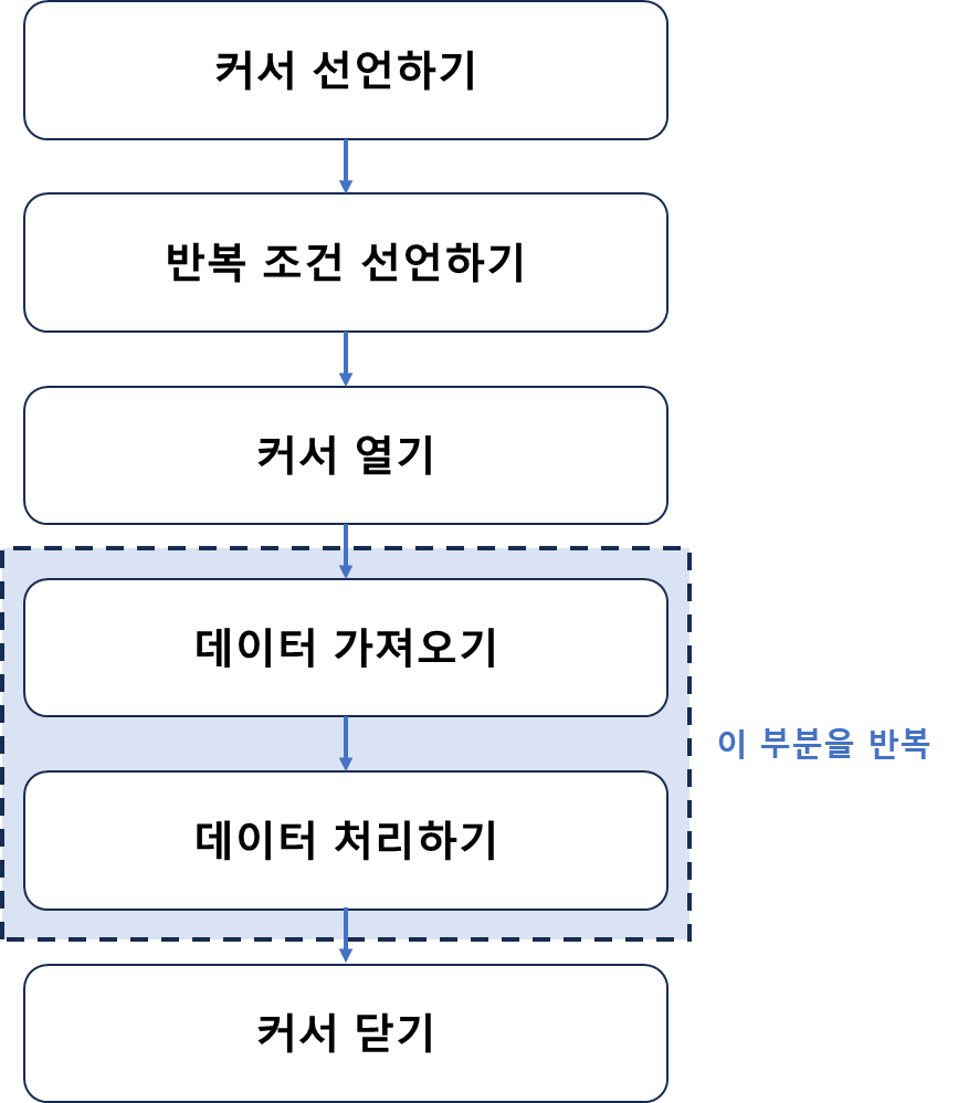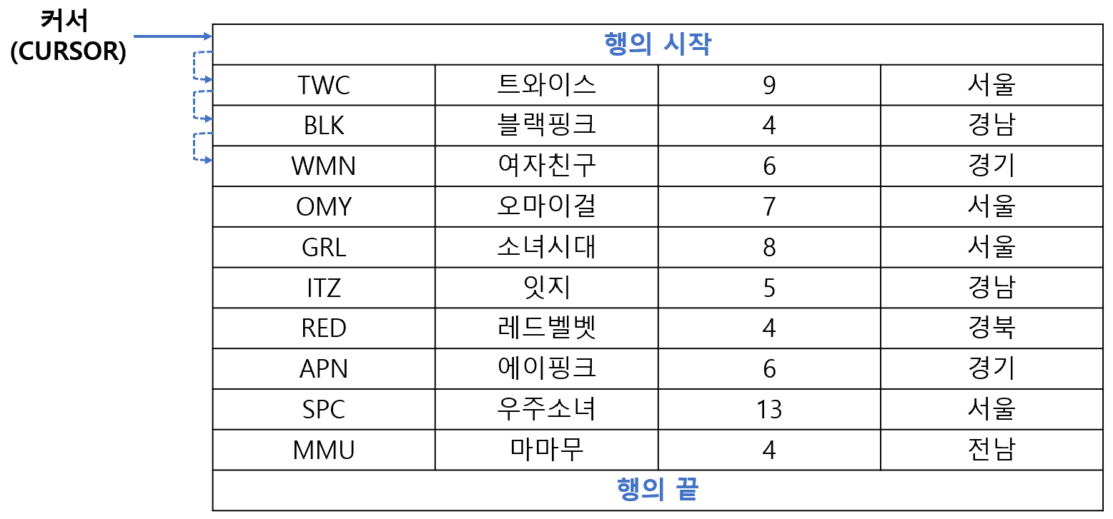 - 커서의 끝까지 한 행씩 접근해서 반복한다.