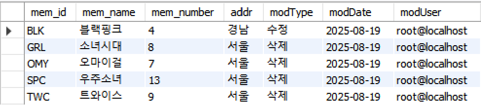 OLD.addr, '삭제', CURDATE(), CURRENT_USER() );