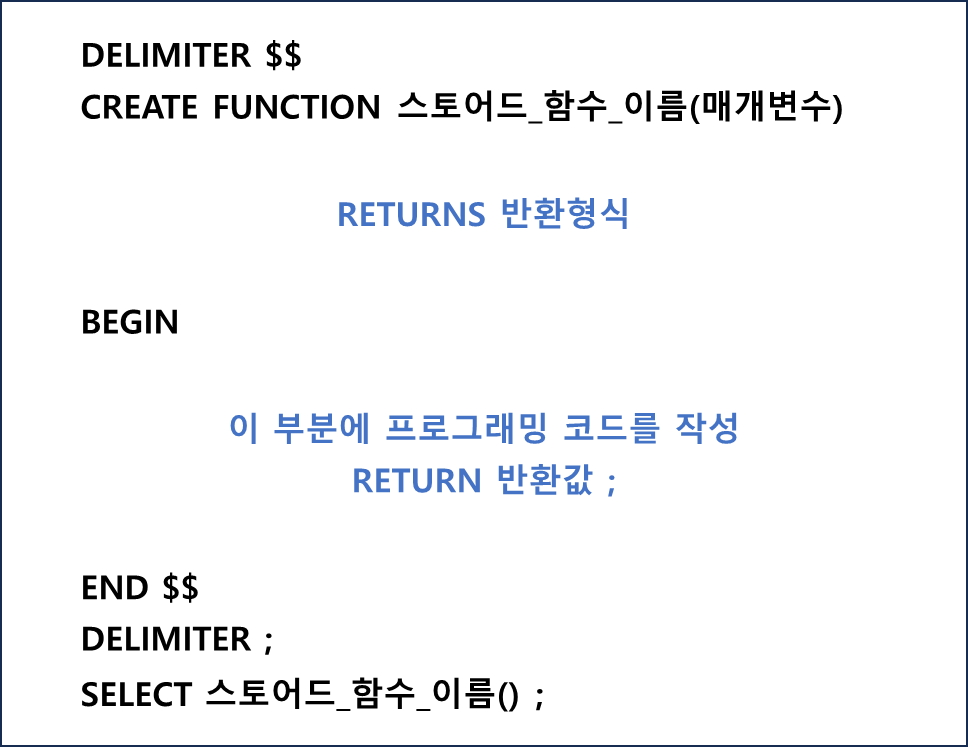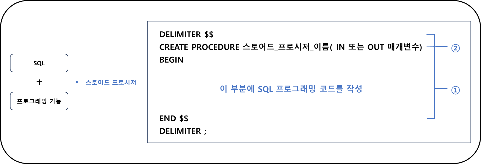 - ①: 필수 항목으로 스토어드 프로시저를 묶어주는 기능을 한다.
