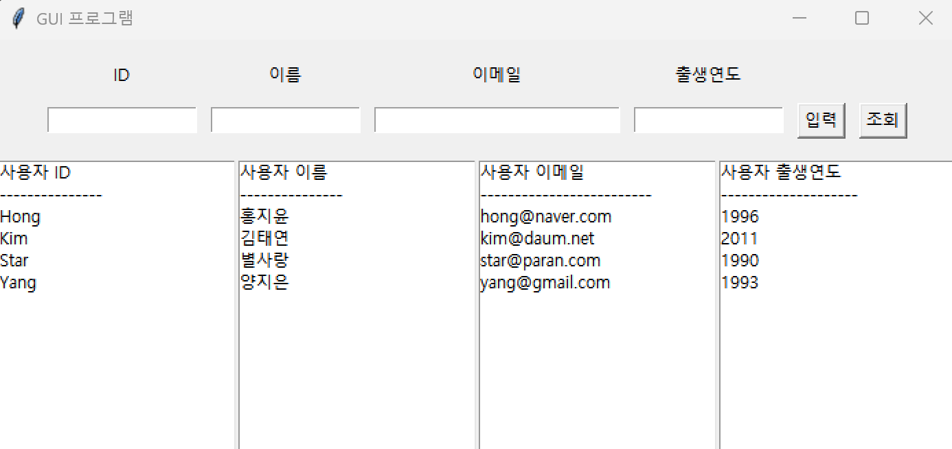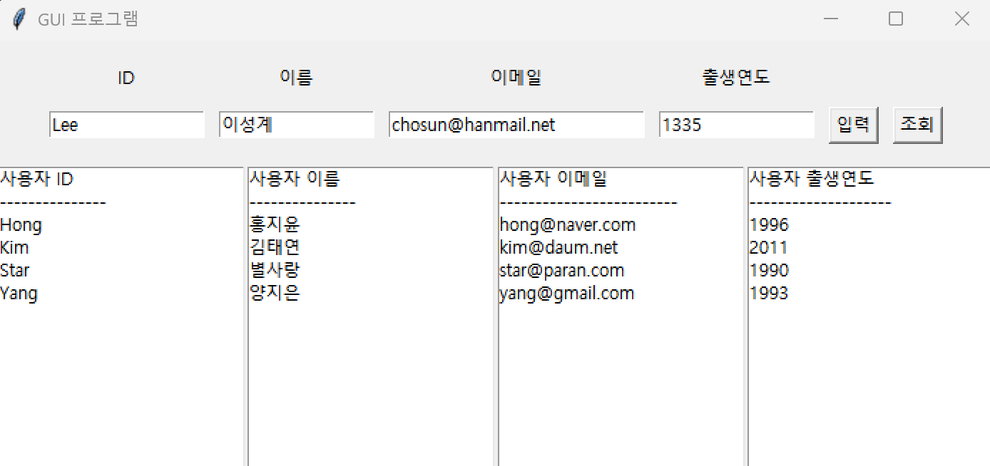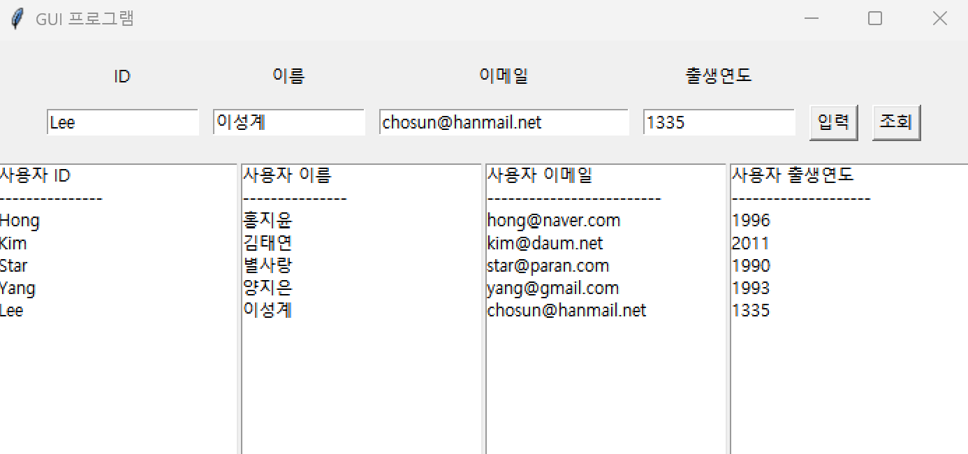 데이터 입력 & 조회할 수 있는 GUI 프로그램 만들기