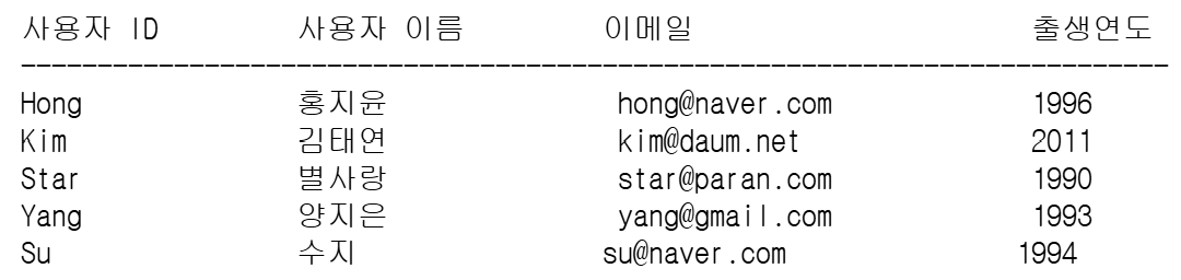 print(f'{"사용자 ID":<15}{"사용자 이름":<15}{"이메일":<25}{"출생연도":<5}')