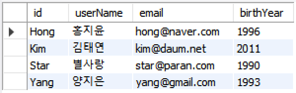 cur.execute("INSERT INTO userTable VALUES('Hong','홍지윤','hong@naver.com','1996')")