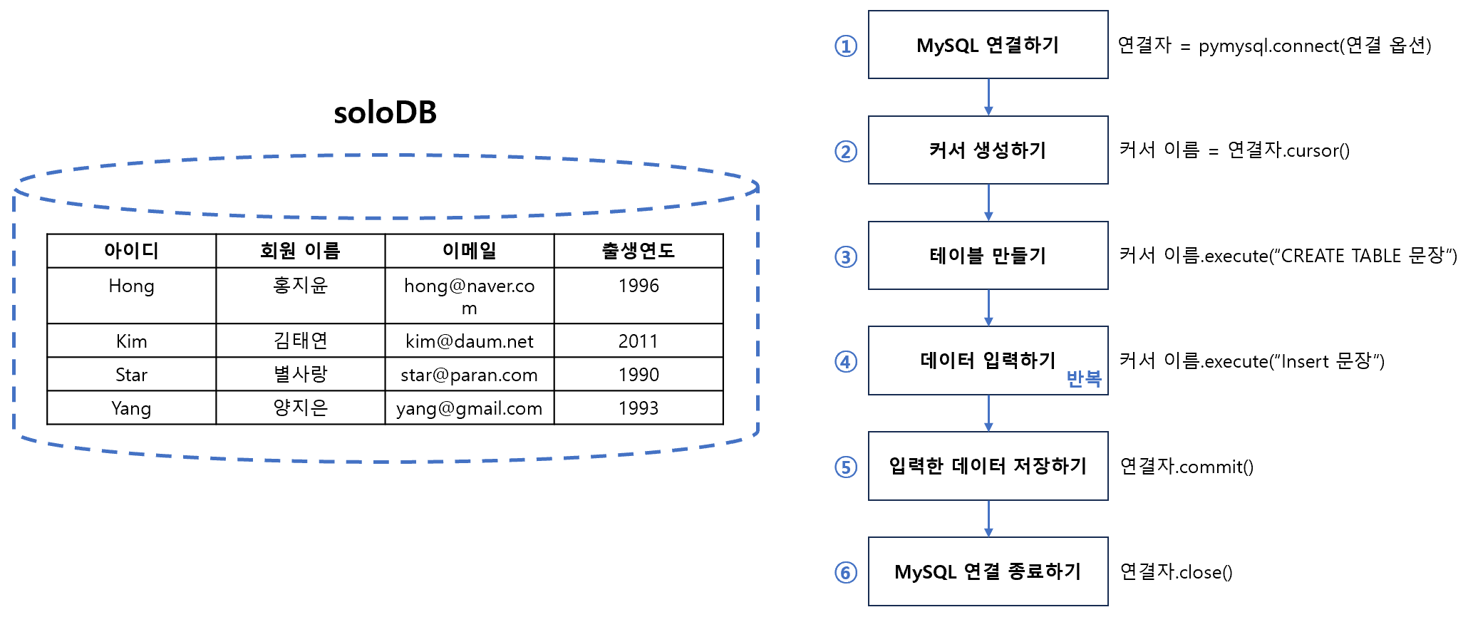 - MySQL과 Python을 연동해서 프로그래밍하면, MySQL 전문가가 할 수 있는 기능들을 일반 사용자도 손쉽게 사용할 수 있다.